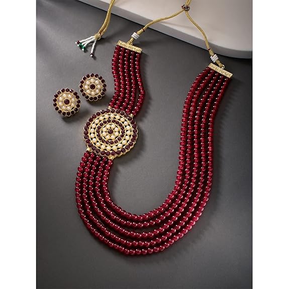 Peora Gold Plated Traditional 5 Layer Kundan Pearl Long Necklace Earrings Jewellery Set for Women